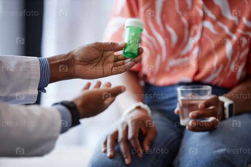 Ближайшее изображение доктора, держащего бутылку с таблетками в руках консультирующей женщины