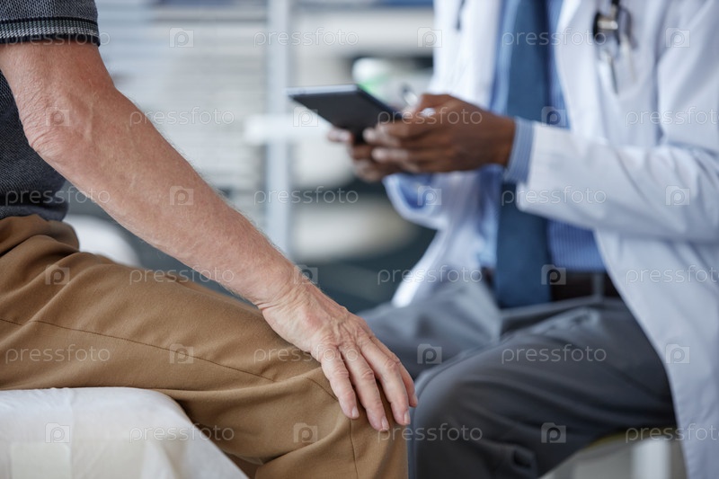 Пожилой пациент сидит на экзаменационном столе