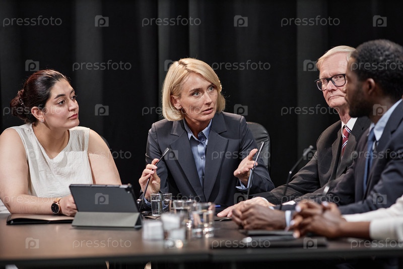 Женщина-политик обсуждает законопроект с коллегами по работе на заседании городского совета