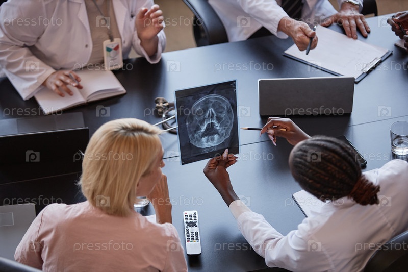 Женщина-нейрохирург держит череп, рентгеновское сканирование при анализе изображения на встрече в офисе