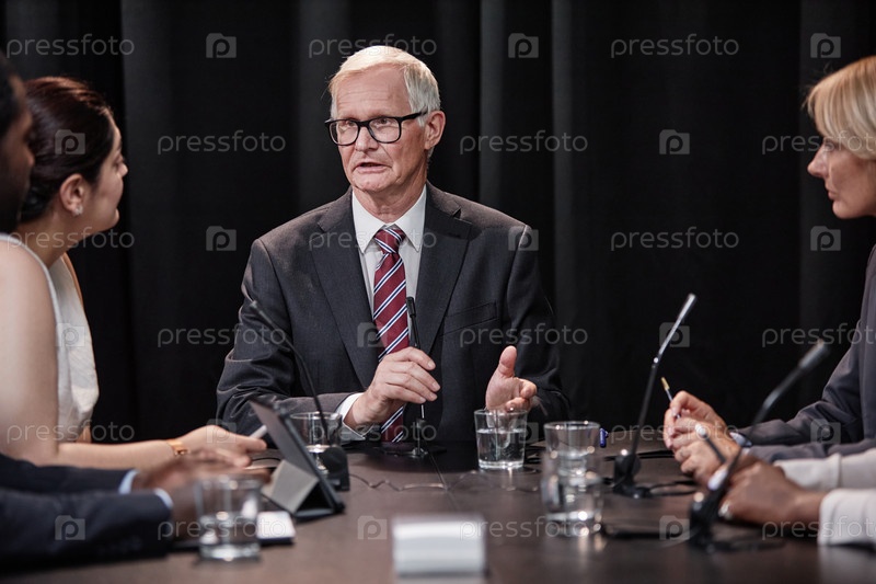Старший политик обсуждает проект закона Дебаты об инициативах за столом во время заседания городского совета
