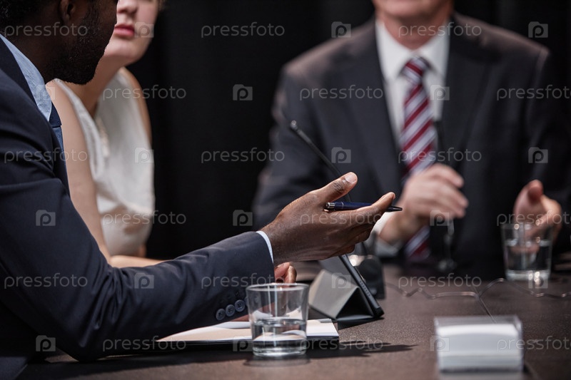 Рука мужского политика, задающего вопрос спикеру во время презентации, сидя за столом