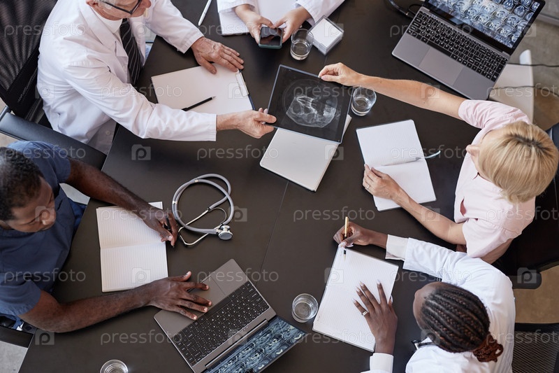 Женщина-радиолог передает МРТ-сканирование коллеге за столом заседаний в офисе