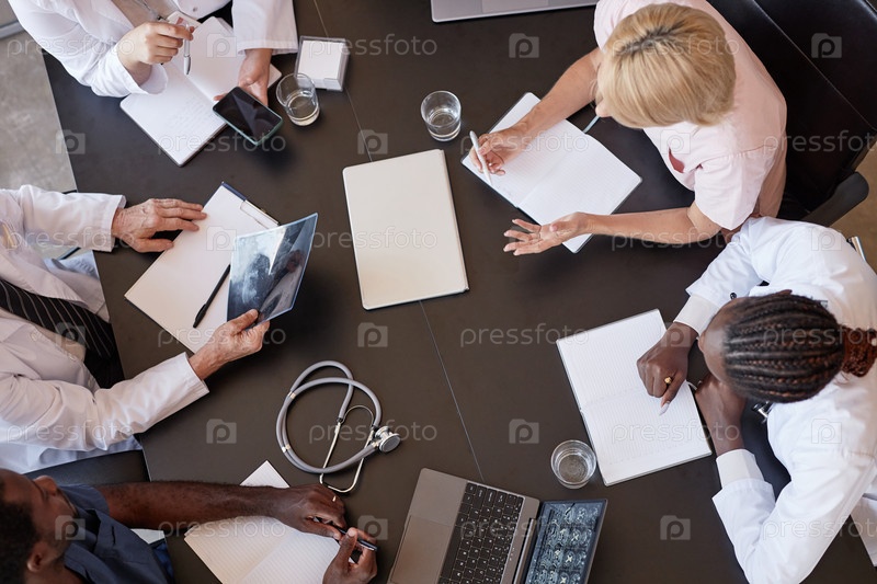Женщина-радиолог передает МРТ-сканирование коллеге за столом заседаний в офисе