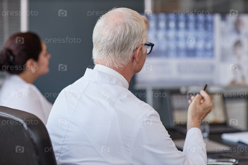 Старший врач-мужчина разговаривает с коллегами, сидя за столом в клинике