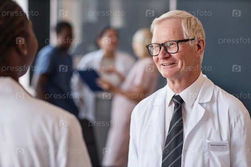 Улыбающийся старший мужской врач разговаривает с коллегой после медицинского семинара в клинике