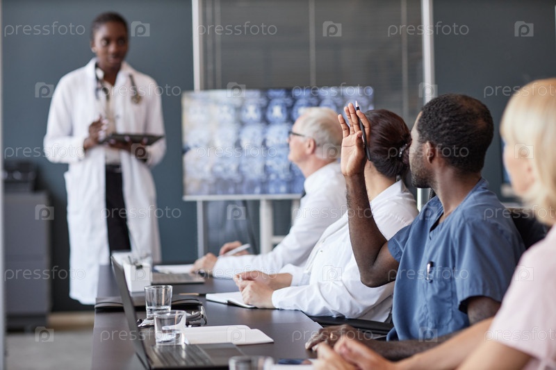 Черный мужчина задает вопрос спикеру в групповом семинаре с коллегами по работе в зале совещаний