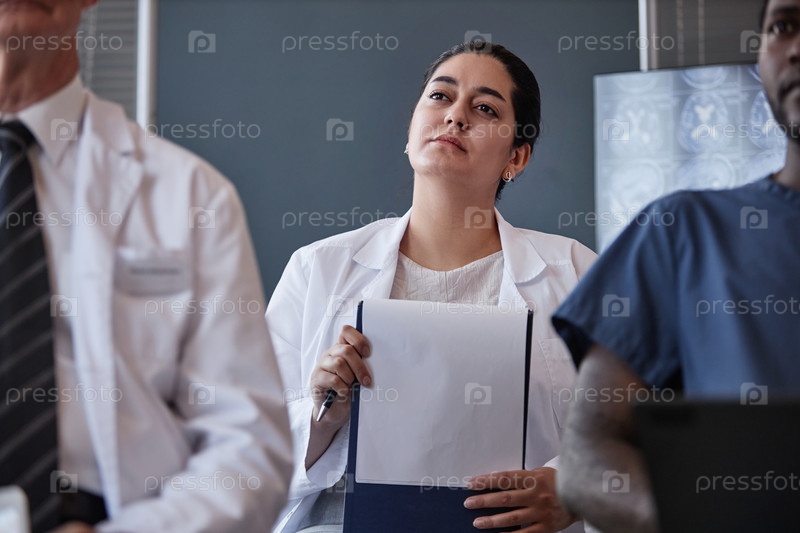 Женщина-врач, держащая доску при прослушивании коллег Презентация в клинике
