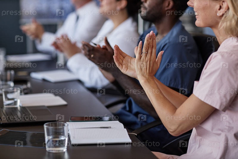 Руки позитивной женщины-врача, аплодирующей коллегам на рабочем совещании в конференц-зале