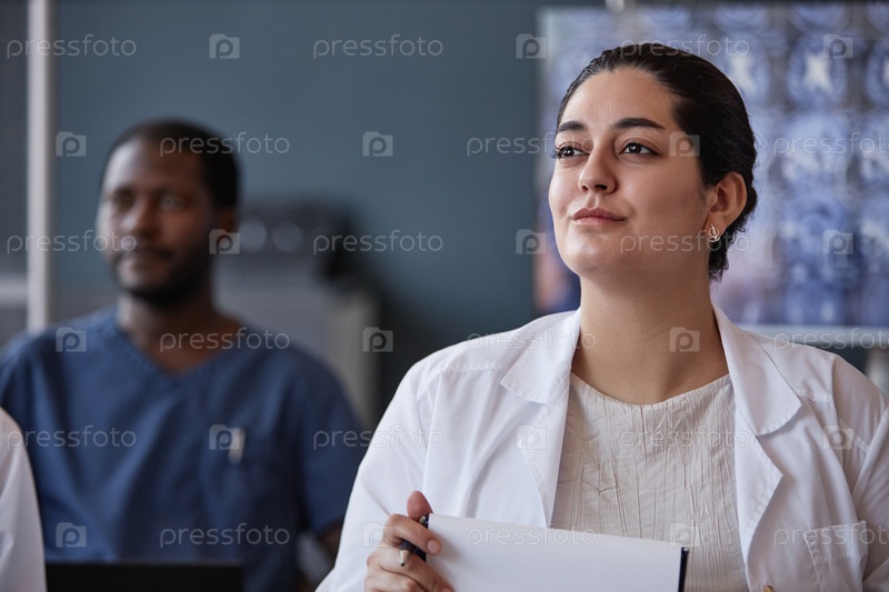 Улыбающаяся женщина-врач слушает коллег Презентация в конференц-зале