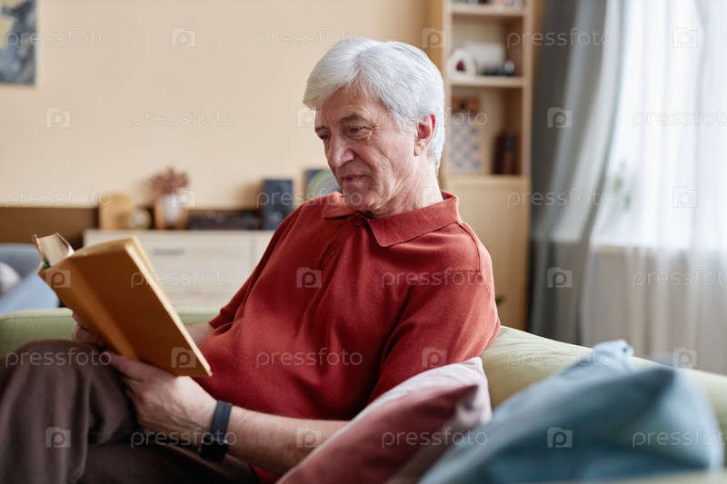 Беловолосый старший мужчина читает книгу, сидя на диване