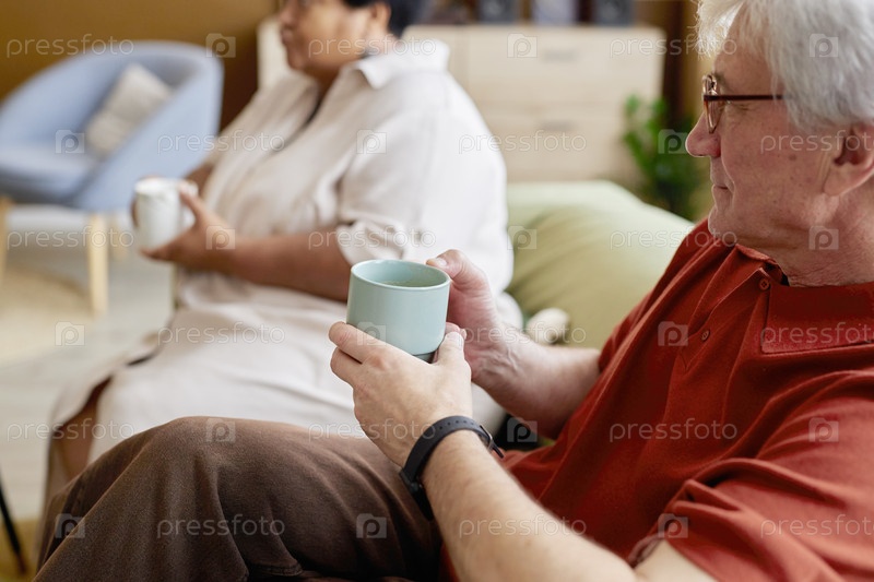 Пожилой мужчина держит кружку с друзьями дома
