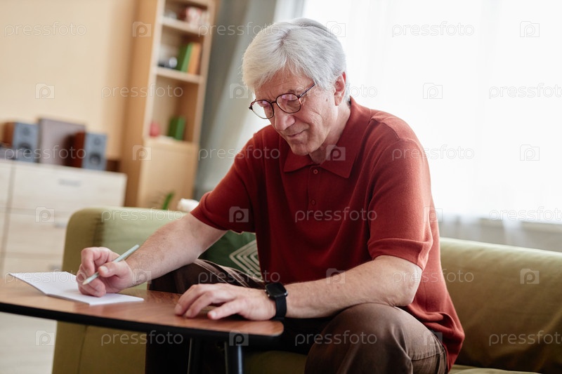 Старший мужчина пишет музыку или поэзию наслаждается хобби на пенсии
