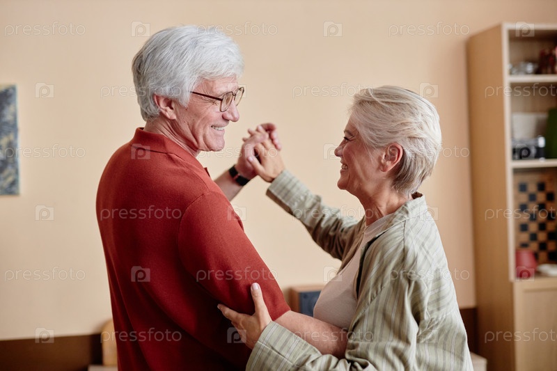 Счастливая старшая пара танцует, слушая музыку дома