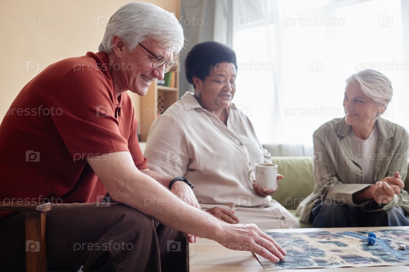 Улыбающийся старший мужчина играет в настольную игру с друзьями