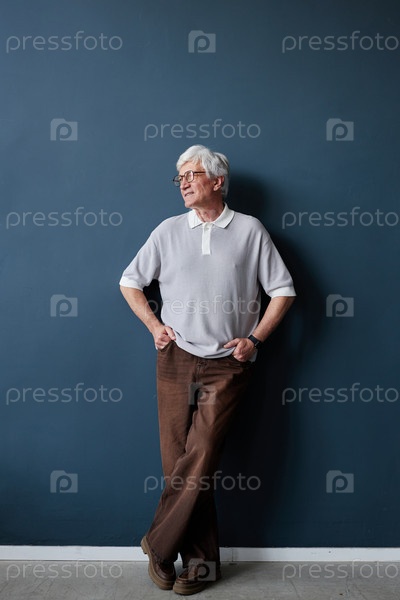 Беловолосый старший мужчина позирует в студии