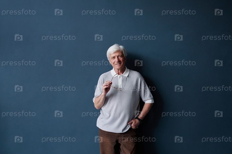 Старший человек на синем в студии