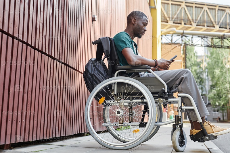 Черный мужчина, использующий инвалидное кресло в городской обстановке