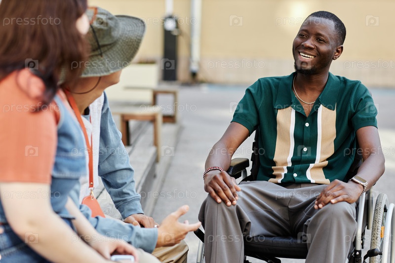 Улыбающийся чернокожий мужчина с инвалидностью разговаривает со своими друзьями