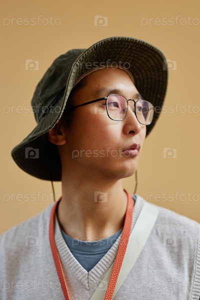 Минимальный ближайший портрет азиатского мужчины, носящего шляпу