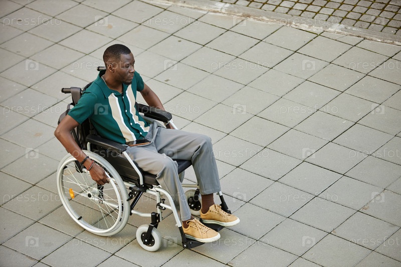 Черный мужчина использует инвалидное кресло на графическом тротуаре