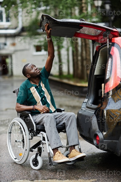 Человек с инвалидностью закрывает багажник автомобиля
