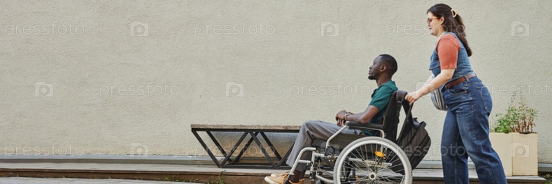 Чернокожий мужчина с инвалидностью на пандусе со своим другом