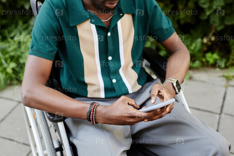 Ближайшее изображение чернокожего человека с инвалидностью, использующего смартфон
