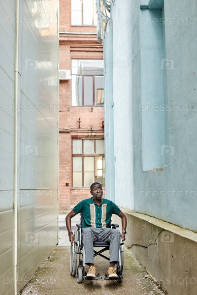 Широкоугольный чернокожий мужчина, пользующийся инвалидной коляской в городе