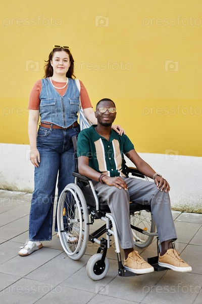 Человек с инвалидностью, использующий инвалидный кресло, позирует со своим другом