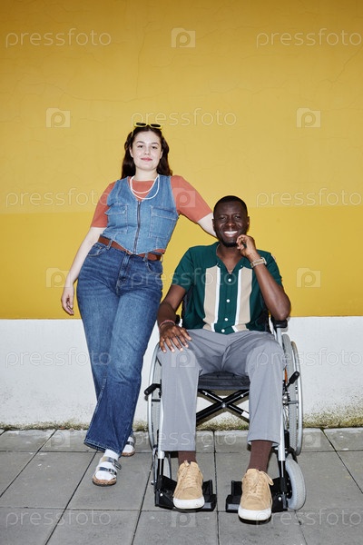 Черный мужчина, использующий инвалидное кресло, позирует с другом на желтом