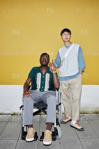 Чернокожий мужчина с инвалидностью позирует со своим другом на желтом