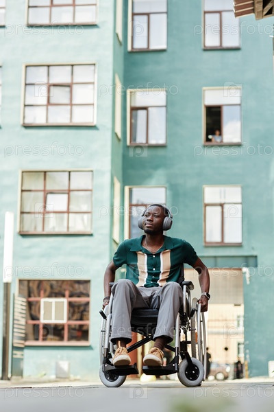 Вертикальный широкоугольный снимок чёрного человека на инвалидном кресле в городе