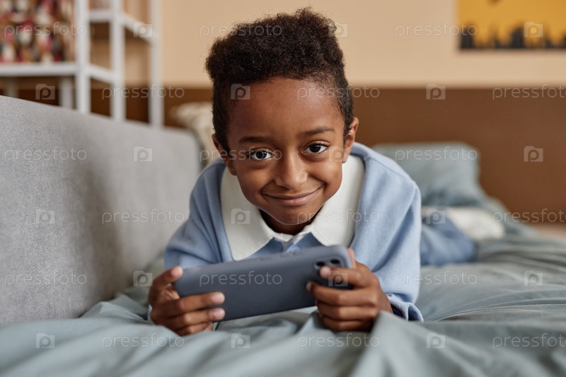 Портрет счастливого чернокожего мальчика, использующего телефон во время просмотра камеры в постели дома