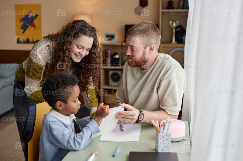 Улыбающиеся молодые мама и папа рисуют с усыновленным ребенком, сидя за столом в помещении