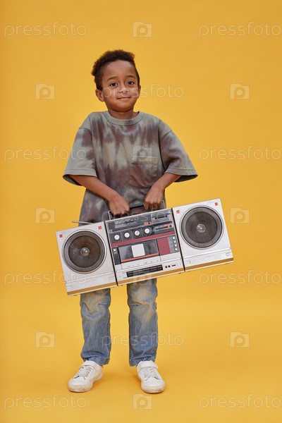 Девятнадцать улыбающихся чернокожих мальчиков держат старинный радиоплеер в желтой студии