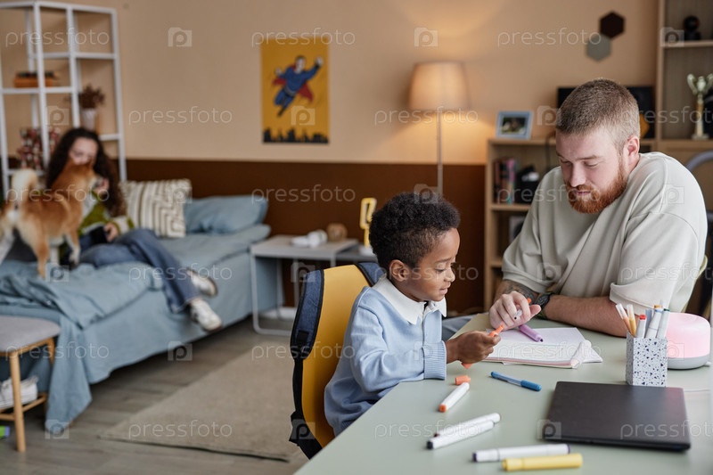 Молодой чернокожий мальчик рисует ручками, пока папа помогает сыну за столом в детской спальне