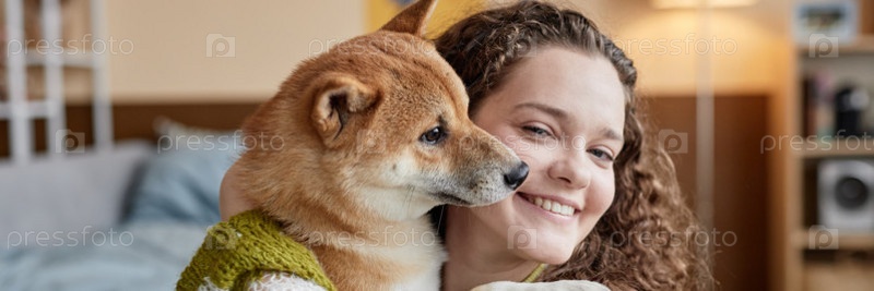 Header Image of Smiling Female Pet Owner Hugging Shiba Inu Dog while Posing at Home - улыбающаяся хозяйка домашнего животного обнимает собаку Шибу Ину, пока позирует дома