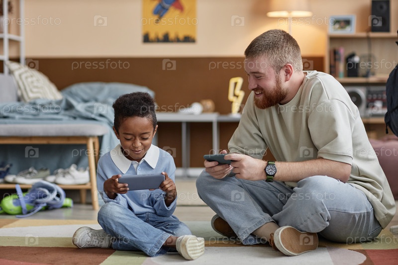 Дошкольный чернокожий мальчик играет в телефон с улыбающимся приемным папой, сидящим на полу внутри дома