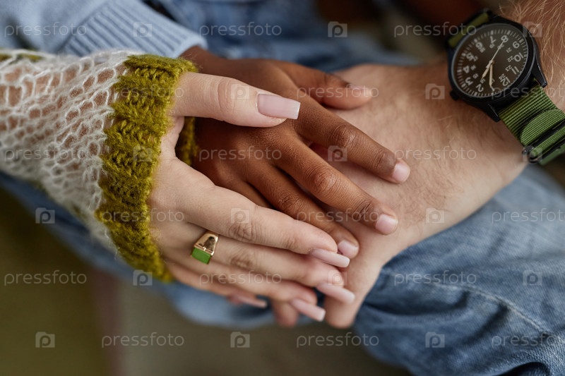 Пара нежно держит за руки усыновленного чернокожего мальчика в помещении