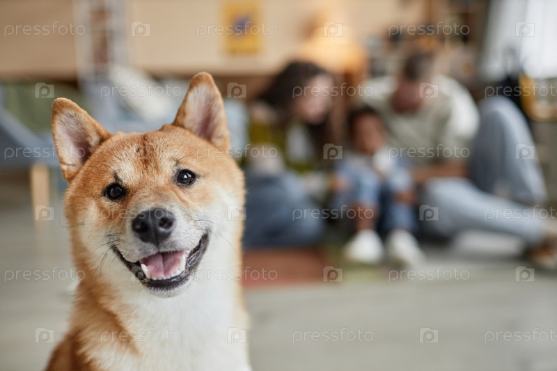 Портрет маленькой красной собаки, улыбающейся на камеру в гостиной