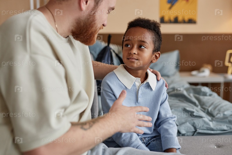 Папа разговаривает с черным мальчиком, сидящим в спальне воспитывая усыновленного ребенка с заботой