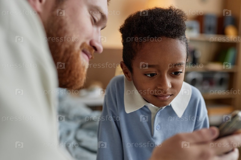 Счастливый усыновленный ребенок пользуется телефоном с папой, проводя время вместе в детской комнате