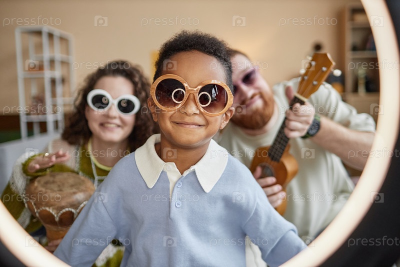 Портрет улыбающегося усыновленного чернокожего мальчика в солнцезащитных очках запись видео с родителями внутри