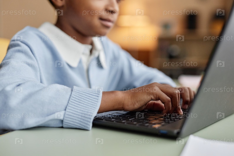 Руки чернокожего мальчика, пишущего на ноутбуке во время учебы за столом в детской комнате