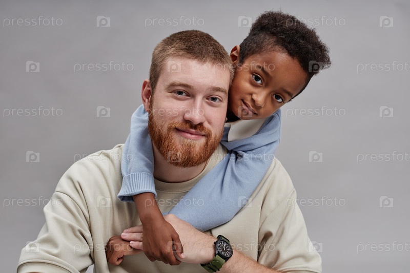 Портрет усыновленного чернокожего мальчика, обнимающего счастливого папу в студии на сером фоне