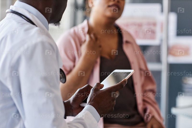 Черный доктор, держащий планшет и разговаривающий с пациентом в клинике