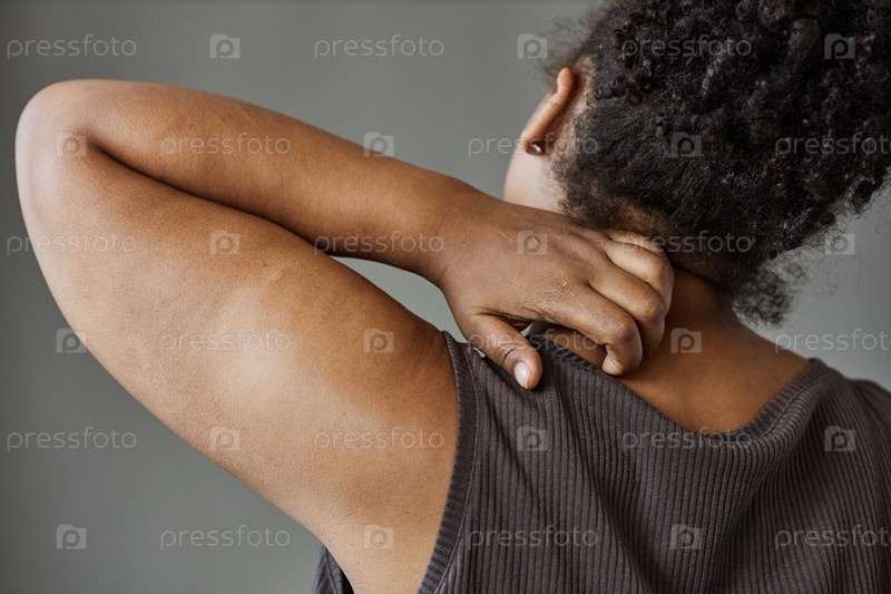 Черная женщина царапает шею Closeup