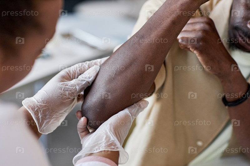 Ближайшее изображение дерматолога, осматривающего локоть