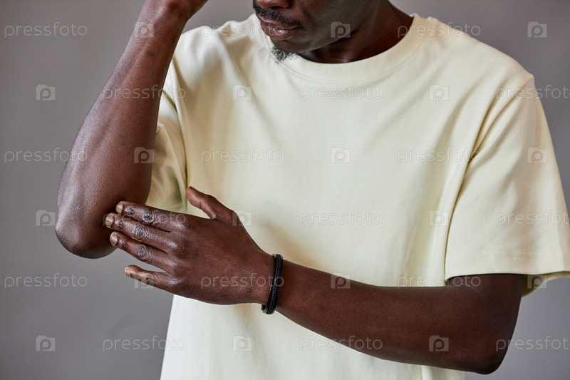 Черный мужчина, указывающий на локоть, страдает от проблем с кожей